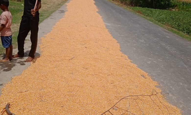 रोड पर सूख रही मक्का से आम लोग हो रहे सड़क दुर्घटना के शिकार। घुसूपुर में हुआ बाइक सवार घायल