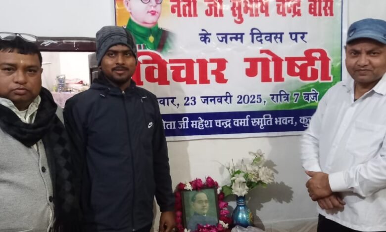 मैनपुरी। जनपद के कस्बा कुरावली में आजाद हिंद फौज के लेफ्टिनेंट दामोदर सिंह चौहान निवासी कुरावली के पौत्र आदरणीय शिशुपाल सिंह की अध्यक्षता में श्री महावीर जीव दया समिति कुरावली के तत्वाधान में नेताजी सुभाष चंद्र बोस की जयंती पर एक विचार गोष्ठी का आयोजन महेशचंद्र वर्मा नेताजी स्मृति भवन में आयोजित किया गया। सर्वप्रथम शिशुपाल सिंह को अंगवस्त्र, शॉल से सम्मानित किया गया। गोष्ठी का संचालन शशि भूषण सिंह ने किया और नेताजी के जीवन पर प्रकाश डालते हुए शिशुपाल सिंह ने कहा कि भारत की आजादी के लिए अनेक वीर सपूतों ने अपना बलिदान कर दिया। सुभाष चंद्र बोस भी महान नेता, देशभक्त थे। उन्होंने अपने देश के लिए सर्वस्त्र बलिदान कर दिया। सुभाष चंद्र बोस का जन्म उड़ीसा के कटक क्षेत्र में २३ जनवरी १८९७ को हुआ । इनकी माता प्रभादेवी और पिता जानकीनाथ बोस कटक के एक मशहूर सरकारी वकील थे। नेता जी नेता जी ने बी ०.ए o की परीक्षा कलकत्ता विश्व विद्यालय से प्रथम श्रेणी से पास किया। सन् १९२० में नेता जी प्रशासनिक परीक्षा में चौथा स्थान प्राप्त करके उत्तीर्ण हुए। स्वामी विवेकानंद, महात्मा गांधी और अन्य से प्रभावित नेता जी ने १९२१ में नौकरी से इस्तीफा दे दिया। भगत सिंह को फांसी होने के बाद इनका गांधी से राजनीतिक मतभेद शुरू हो गया। नेता जी ने १९४३ में आजाद हिंद फौज की स्थापना की। देश की आजादी में इसका अहम योगदान था। एक विमान दुर्घटना में १८ अगस्त १९४५ को ताइवान में इनकी मृत्यु हो गई। वीर क्रांतिकारी सुभाष चंद्र बोस की देश भक्ति से हमे प्रेरणा लेनी चाहिए। गोष्ठी में राष्ट्रीय स्वयं सेवक संघ के जिला प्रचार प्रमुख दीपक तिवारी , नगर प्रचारक अंकित , सोहन , कौशल , अंकुर जैन , जीव दया समिति के अंकित जैन , अनुराग जैन, प्रवीण जैन नाती, अखिल जैन, सोनू ,अखिल जैन , गुंजन, विवेक जैन, रोमी, आशीष जैन, चुन्नू, अवनीश जैन, ज्ञायक जैन एवं स्वतंत्रता सेनानी कात्यानी देवी , पिंटू , रवि आदि लोग उपस्थिति रहे ।
