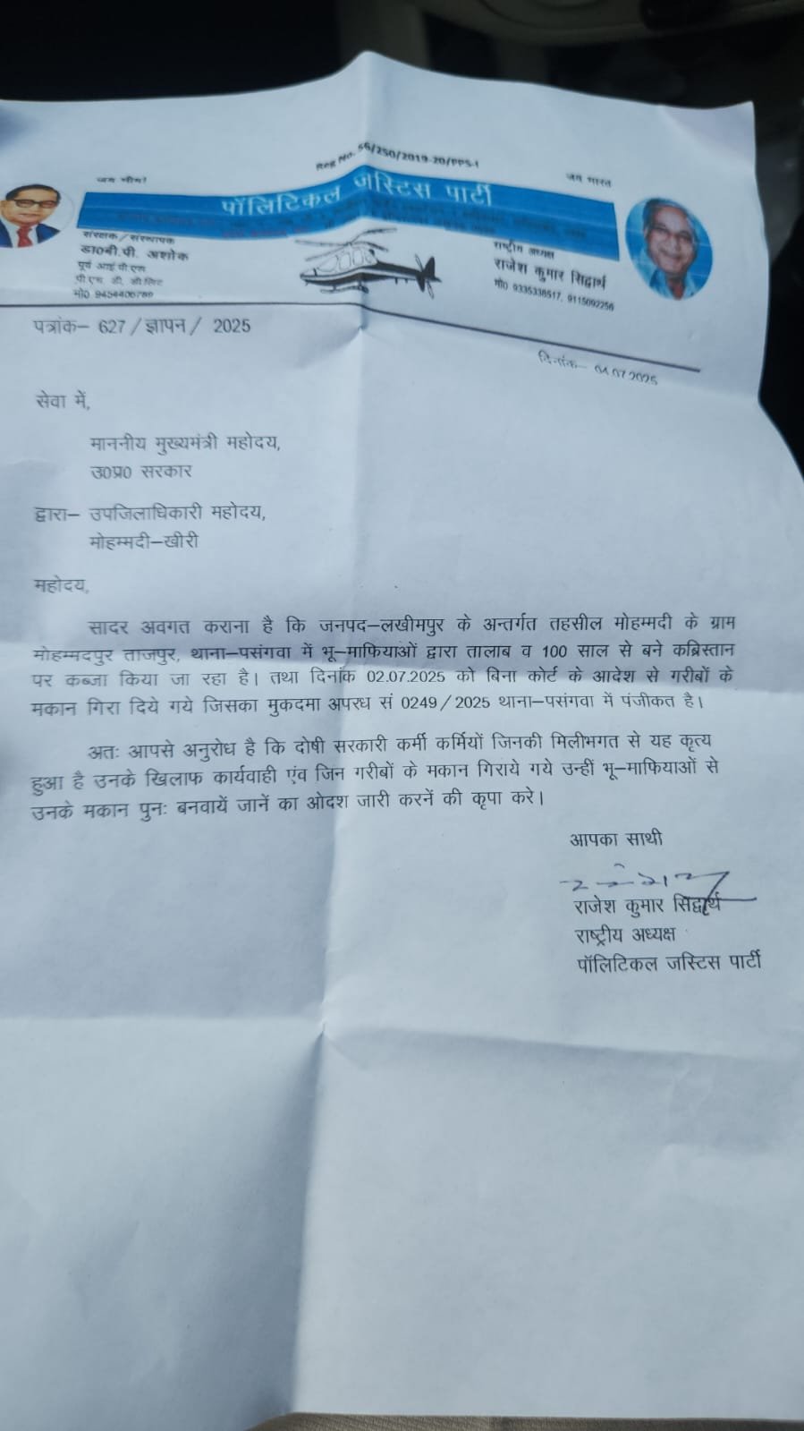 लखीमपुर खीरी के मोहम्मदी तहसील के ग्राम मोहम्मदपुर ताजपुर थाना पसगवां में भू माफियाओ द्वारा तालाब व 100 साल से बने कब्रिस्तान पर कब्जा किया जा रहा था. जिसको लेकर पॉलिटिकल जस्टिस पार्टी के राष्ट्रीय अध्यक्ष राजेश सिद्धार्थ द्वारा एक ज्ञापन उप जिलाधिकारी मोहम्मदी को सौपा गया.जिसमे उनके द्वारा भू माफियाओं के साथ-साथ सरकारी कर्मचारियों की मिलीभगत की संका जताई गई. और भू माफियाओं व सरकारी कर्मचारियों पर उचित कार्रवाई करने के लिए भी कहा गया. ज्ञापन के माध्यम से यह भी बताया गया कि भूमाफियाओं द्वारा कुछ गरीबों के मकान भी तोड़े गए. जिसका उन्हें मुआवजा दिलाने की भी बात कही. ज्ञापन देते समय उनके साथ काफी ग्रामीण भी मौजूद थे