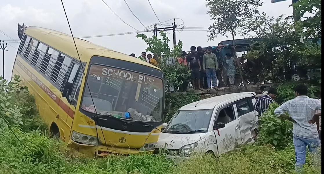 बच्चों को छोड़कर वापस लौट रही स्कूली बस अनियंत्रित हो कर वेगनार कार से टकरा कर खंदक में गिरी।