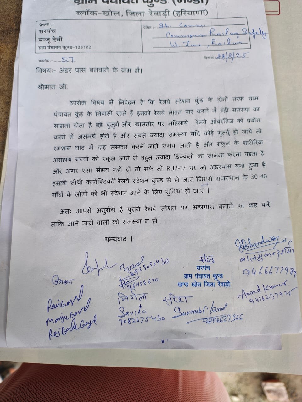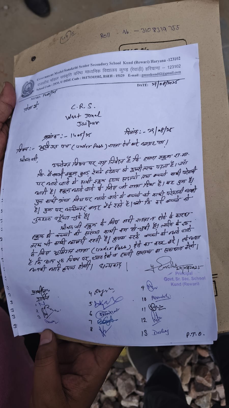 रेवाड़ी। कुंड स्थित गवर्नमेंट मॉडल संस्कृत सीनियर सेकेंडरी स्कूल के विद्यार्थियों ने सी.आर.एस. वेस्ट जोन जयपुर को एक ज्ञापन भेजकर अंडरपास (रेलवे क्रॉसिंग) की समस्या को तुरंत हल करने की मांग की है।