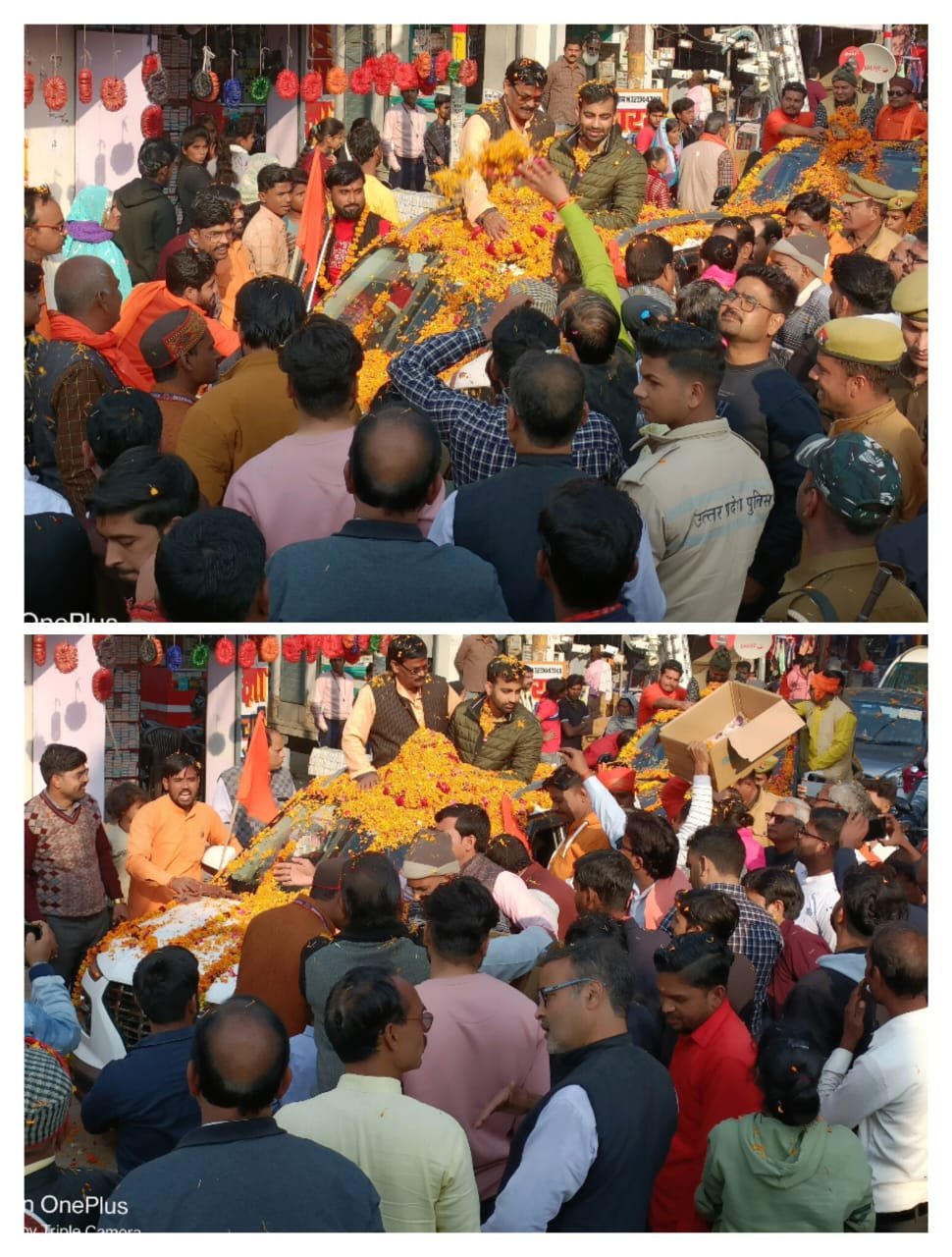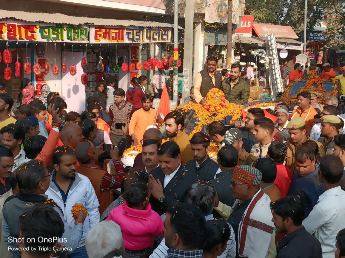 कस्बे में पँहुचते ही पूजित कलश यात्रा का बस स्टैंड पर उच्च शिक्षा राज्यमंत्री के पुत्र आदि तिवारी और ब्लाक प्रमुख समेत सैकड़ों भाजपा नेताओं एवँ सनातनी लोगों ने भव्य स्वागत किया।तथा फूलों की वर्षा कर ते हुये बस स्टैंड से कस्बे के रामजानकी मंदिर तक पँहुचीं।जहां पर पूजा अर्चना के बाद घर घर पीले चावलों को भेजने का कार्यक्रम शुरू हो गया।। भगवान श्रीराम की नगरी अयोध्या ऐतिहासिक बनने जा रही है।सोमवार को पूजित कलश यात्रा विश्व हिंदू परिषद के कार्यकर्ता जैसे ही कस्बे में पँहुचे तो हिन्दू समुदाय का जन सैलाब उमड़ पड़ा।अब पूजित अक्षत कलश रामजानकी मंदिर में स्थापित की गई।।अक्षत कलश बस स्टैंड सिनेमा चौराहा घास मंडी तिराहा घंटाघर होते हुए चौक में राम जानकी मंदिर पर स्थापित की गई।कलश के पीले चावलों को अंगदपुर शाहाबाद और आस-पास क्षेंत्रों में राम भक्ति से जुड़े परिवारों को घर-घर वितरित कर अयोध्या में 22 जनवरी को होने वाले मंदिर उद्घाटन में शामिल होने का निमंत्रण दिया जायेगा।इस मौके पर आदि तिवारी ब्लाक प्रमुख त्रिपुरेश मिश्र,लालाराम राजपूत चन्द्र प्रकाश सिंह,रोहित तिवारी,रंजीत सिंह,अतुल मिश्र,सुभाष रस्तोगी,अंकित गुप्ता,अंकित मिश्र,कुलदीप श्रीवास्तव,प्रवीण सिंह अजय कुमार,अनूप,शिवम सिंह,अशोक गुप्ता,योगेंद्र गुप्ता,अंकुर पिंटू पांडे अंकित मिश्रा,सुभाष रस्तोगी,विमल वर्मा अन्य बहूत से कार्यकर्ता व पदाधिकारी मौजूद रहें