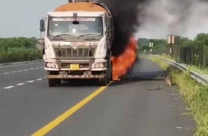 आगरा-लखनऊ एक्सप्रेसवे पर टायर फटने से टैंकर में लगी आग,चालक परिचालक ने कूदकर बचाई जान।