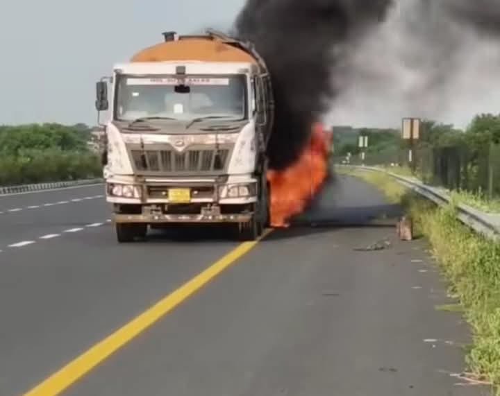 आगरा-लखनऊ एक्सप्रेस-वे पर टायर फटने से टैंकर में लगी आग।