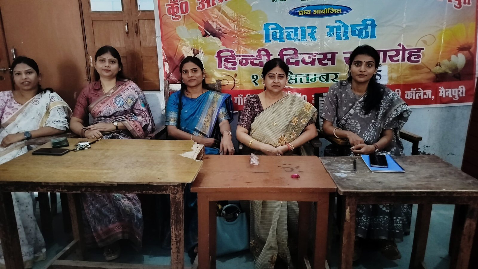 मैनपुरी। आज कुंवर आर. सी. महिला महाविद्यालय में हिंदी दिवस की पूर्व संध्या पर विचार गोष्ठी का आयोजन किया गया। महाविद्यालय की संयुक्त सचिव डॉ सुशीला त्यागी ने बोल हुए कहा कि हिन्दी दिवस मनाना न सिर्फ भाषा के गौरव को बढ़ाता है, बल्कि हमें यह भी याद दिलाता है कि अपनी मातृभाषा को अपनाना और आगे बढ़ाना कितना ज़रूरी है। महाविद्यालय की प्राचार्या डॉ शेफाली यादव ने कहा कि हिंदी अलग-अलग क्षेत्रों और संस्कृतियों के लोगों को एक साथ लाती है, जिससे एक राष्ट्रीय भाषा के रूप में इसकी भूमिका और मजबूत होती है। तत्पश्चात् अपने अध्यक्षीय भाषण में हिंदी विभागाध्यक्ष डॉ. कुसुम यादव ने बताया कि हमें हिंदी भाषा के महत्व को समझना होगा जिससे हिंदी साहित्य में जो मूल्य हैं वे एक पीढ़ी से दूसरी पीढ़ी तक पहुंच सके। हिंदी विभाग की प्राध्यापिका जया सिंह ने हिंदी की संवैधानिक स्थिति पर बात की और छात्राओं को बताया कि केवल हिंदी की बिंदी पर टिके के न रहें बल्कि जो हमारी समृद्ध काव्य परंपरा का इतिहास है उसका भी पाठ करें।  हिंदी विभाग की शिक्षिका डॉ. गीता प्रजापति ने छात्राओं को बताया कि सिनेमा जगत के माध्यम से हिंदी की पहुंच वैश्विक स्तर पर हुई है और हिंदी से मनोरंजन जगत की दुनिया में रोजगार के नए नए अवसर भी मिल रहें हैं। समाजशास्त्र विभाग की शिक्षिका डॉ प्रियंका सोनकर ने स्वरचित कविताओं का पाठ कर हिंदी की अस्मिता को स्त्री की अस्मिता से जोड़ा। इस अवसर पर अमृता,करिश्मा,भावना,आस्था,गीतांजलि, संध्या नीशू,अमृता, रितु,निधि,स्नेहा,शिवानी आदि छात्राओं ने काव्य पाठ,गीत और भाषण में बढ़-चढ़ कर भाग लिया। कार्यक्रम में महाविद्यालय की शिक्षिका डॉ प्रतिभा जायसवाल के साथ अन्य शिक्षक/ शिक्षिकायें भी मौजूद रहीं। उक्त कार्यक्रम का संचालन हिंदी विभाग की प्राध्यापिका जया सिंह ने किया।