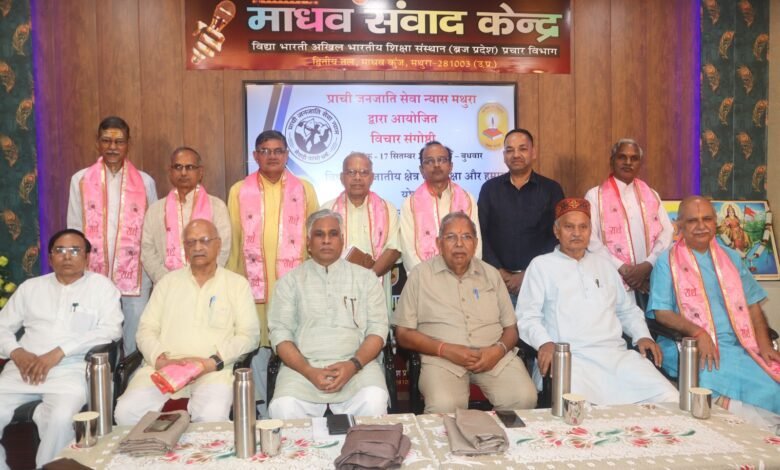 मथुरा- माधव कुंज स्थित विद्या भारती ब्रज प्रदेश के माधव संवाद केन्द्र पर विचार संगोष्ठी का आयोजन महेश चंद्र अग्रवाल (प्रेस वालों) की अध्यक्षता में हुआ।