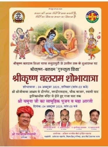 4 अक्टूबर को मथुरा नगर में विशाल श्री कृष्णा बलराम की शोभायात्रा निकाली जाएगी 5 अक्टूबर को मथुरा से यात्रा प्रस्थान करेगी बड़ा स्थल जयपुर झालावाड़,कोटा अगर होते हुए 9 तारीख को उज्जैन पहुंचेगी ।