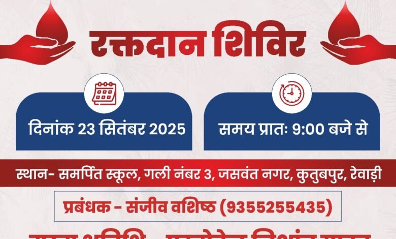 रेवाड़ी में लगेगा विशाल रक्तदान शिविर