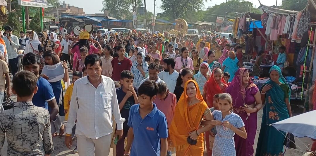 मैनपुरी /घिरोर|| कस्बा में प्रत्येक वर्ष की भांति इस वर्ष भी श्रीमांता जागरण मंडल के द्वारा माता शेरा वाली की शोभायात्रा माता गली नाहिली रोड़ से शोभायात्रा का शुभारंभ नगर पुरोहित पंडित जयदेव दीक्षित घिरोर नगर पंचायत अध्यक्ष यतेंद्र कुमार जैन के द्वारा पूजा पाठ कर इस शोभायात्रा को रवाना किया जो माता वाली गली नाहिली रोड से चलकर थाने वाली गली होते हुए गाजे बाजे के साथ काफी संख्या में महिलाएं पुरुष भक्त जन माता रानी का भजन कीर्तन करते हुए साथ चल रहे थे शोभायात्रा संदीप मार्केट सब्जी मंडी मनकामेश्वर मंदिर डालगंज पुराना बस स्टैंड करहल तिराहा से होते हुए कस्बा घिरोर नहर पुल पर पहुंची कस्बा घिरोर में जगह-जगह श्रद्धालु जनों ने मीठा शरबत फल व मिष्ठान भक्तजनों को वितरित किये नहर, कोठी घाट पर माता रानी को स्नान व पूजन करवा कर वापस शोभायात्रा माता मंदिर के लिए रवाना हो गई सुरक्षा की द्रष्टि से इस शोभा यात्रा की कमान घिरोर थाना प्रभारी छत्रपाल सिंह बखूबी संभाले हुए थे जिसमें घिरोर उपनिरीक्षक राकेश दीक्षित उपनिरीक्षक महेंद्र प्रताप सिंह उपनिरीक्षक वासुदेव सिंह कांस्टेबल भानु प्रताप सिंह विष्णु भदोरिया महिला कांस्टेबल रश्मी मोनिका आदि काफी संख्या में पुलिस वल साथ साथ चल रहा था इस शोभा यात्रा में महिलाएं व पुरुष ढोल नगाड़ों की थाप पर माता रानी के भजन गाते हुए साथ-साथ चल रहे थे जिसमें हजारों की संख्या में भक्त लोग मौजूद थे इस मौके पर अध्यक्ष नीलूशाक्य ,रजनेश बघेल, मुकेश, राजू, अजय, अमित वर्मा, आदि काफी संख्या में भक्त लोग मौजूद थे