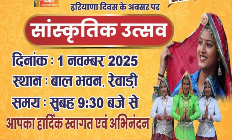 रेवाड़ी। हरियाणा सरकार द्वारा एक नवंबर को 60वें हरियाणा दिवस के उपलक्ष्य में सांस्कृतिक उत्सव का आयोजन होगा। राज्य स्तरीय उत्सव के साथ-साथ प्रदेशभर में सभी जिलों में सांस्कृतिक उत्सव का भव्य आयोजन किया जाएगा। यह रेवाड़ी जिला के लिए हर्ष की बात है कि हरियाणा दिवस के साथ ही रेवाड़ी को भी जिला का दर्जा एक नवंबर 1989 को मिला था। ऐसे में एक नवंबर को हरियाणा के साथ ही रेवाड़ी जिला बनने पर बाल भवन में पूरे उत्साहपूर्ण व गरिमामयी ढंग से सांस्कृतिक उत्सव के रूप में दिवस को मनाया जाएगा।  डीसी अभिषेक मीणा ने बताया कि रेवाड़ी जिला मुख्यालय पर मॉडल टाउन स्थित बाल भवन में सुबह 9:30 बजे से हरियाणवी लोक कलाओं और परंपराओं से ओतप्रोत जिला स्तरीय समारोह का आयोजन होगा इसमें जिलेभर से अधिक से अधिक लोगों की भागीदारी रहेगी।डीसी अभिषेक मीणा ने बताया कि प्रदेश सरकार द्वारा हरियाणा दिवस पर राज्य स्तरीय व जिला स्तरीय सांस्कृतिक उत्सव मनाने का उद्देश्य हरियाणा की समृद्ध लोक संस्कृति, परंपरा और लोक कलाओं को बढ़ावा देना है। उन्होंने बताया कि रेवाड़ी में आयोजित होने वाले जिला स्तरीय समारोह में जिला के विश्वविद्यालय, महाविद्यालयों और विद्यालयों के विद्यार्थियों द्वारा हरियाणवी संस्कृति पर आधारित शानदार प्रस्तुतियां दी जाएंगी। इनमें विद्यार्थियों द्वारा समूह नृत्य, एकल नृत्य, रागिनी, आर्केस्ट्रा और पेंटिंग आदि गतिविधियां शामिल रहेंगी।गौरतलब है कि हरियाणा दिवस पर पंचकूला में राज्य स्तरीय कार्यक्रम का आयोजन किया जाएगा, जिसमें मुख्य अतिथि राज्यपाल प्रो. असीम कुमार घोष होंगे और समारोह में मुख्यमंत्री श्री नायब सिंह सैनी की गरिमामयी उपस्थिति रहेगी। राज्य स्तरीय कार्यक्रम का वचुर्अल माध्यम से प्रसारण जिला स्तरीय सांस्कृतिक उत्सव में दिखाया जाएगा।