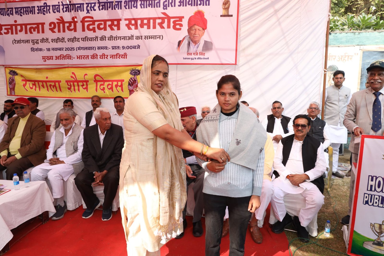 आयोजकों द्वारा 63 शहीद परिवारों को शाल-लोई, रेजांगला शौर्य साहित्य और स्मृति राशि देकर सम्मानित किया गया। यह सम्मान रेजांगला युद्ध के महानायक मेजर शैतान सिंह भाटी (परमवीर चक्र) और रेजांगला समिति के संस्थापक संरक्षक कर्नल राव राम सिंह (पूर्व केंद्रीय मंत्री) की शताब्दी जयंती को समर्पित रहा।