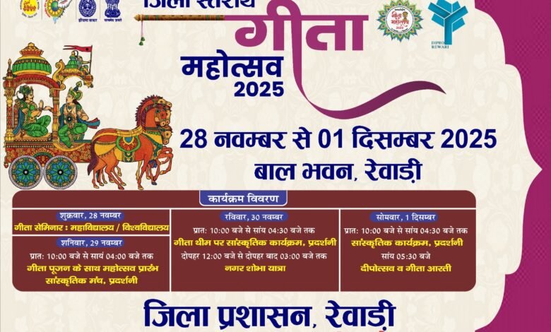 जिला सूचना एवं जनसंपर्क अधिकारी दिनेश कुमार ने बताया कि जिला में 29 नवंबर से 1 दिसंबर 2025 तक गीता महोत्सव का आयोजन बाल भवन रेवाड़ी में किया जाएगा। वहीं 28 नवंबर को इंदिरा गांधी विश्विद्यालय, मीरपुर में महान ग्रंथ गीता पर आधारित सेमिनार का आयोजन किया जाएगा। इसमें विद्वानों द्वारा गीता के उपदेश पर अपना व्याख्यान देंगे। 29 नवंबर से बाल भवन में शुरू होने वाले गीता महोत्सव में गीता थीम पर आधारित सांस्कृतिक कार्यक्रम, प्रदर्शनी तथा जन-जागरूकता कार्यक्रम आयोजित किए जाएंगे। तीन दिवसीय गीता महोत्सव के दौरान बाल भवन को गीतापुरम में सजाया जाएगा। उन्होंने अधिक से अधिक जनभागीदारी के साथ आमजन को गीता महोत्सव में शामिल होने का आह्वान किया।