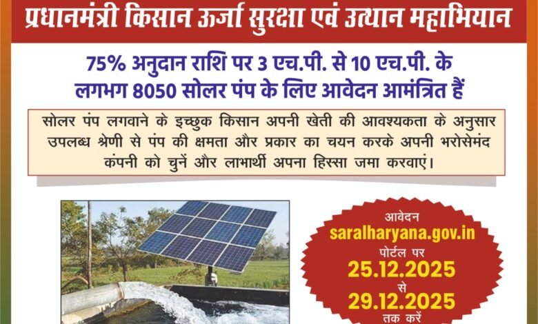 अतिरिक्त उपायुक्त राहुल मोदी ने जानकारी देते हुए बताया कि प्रधानमंत्री कुसुम योजना के अंतर्गत किसान 29 दिसंबर 2025 तक सोलर पम्प लगवाने के लिए हरियाणा सरकार के सरल पोर्टलhareda.gov.in/ पर आवेदन कर सकते है। किसान 75 प्रतिशत अनुदान राशि पर 3 एचपी, 5 एचपी, 7.5 एचपी व 10 एचपी. सोलर पम्प के लिए आवेदन कर सकते है। उन्होंने बताया कि बिजली आधारित कनैक्शन (यूएचबीवीएन/डीएचबीवीएन) के आवेदकों को सौर ऊर्जा पम्प के कनैक्शन के लिए प्राथमिकता दी जाएगी, बशर्तें उनको अपने मौजूदा बिजली कनैक्शन का समर्पण करना होगा। इस वर्ष के लक्षित लाभार्थीयों का चयन परिवार की वार्षिक आय व भूमि धारण के आधार पर किया जाएगा। चयनित लाभार्थीे पीएम कुसुम पोर्टल https://pmkusum.hareda.gov.in/     पर जाकर सरकार द्वारा सूचीबद्ध कम्पनी का चयन करके लाभार्थी हिस्सा जमा करवा सकेंगे, जिसकी सूचना पंजीकृत मोबाईल नम्बर पर प्राप्त होगी। उन्होंने बताया कि किसान अपने खेत के साईज, पानी के लेवल और पानी की जरूरत के अनुसार टाईप और पंप का चयन करें। किसान को अपने खेत में केवल बोर करवा कर देना होगा बाकि पंप स्थापना का कार्य फर्म द्वारा किया जाएगा। इसके अतिरिक्त प्रतीक्षा सूची में मौजूद पुराने सभी आवेदकों को सलाह दी जाती है कि यदि वे अपने मौजूदा सोलर पम्प के प्रकार व क्षमता को बदलना चाहते हैं और नई उपलब्ध 12 श्रेणियों में से किसी सोलर पम्प को लेना चाहते हैं तो वे उसी फैमली आईडी का उपयोग करते हुए नया आवेदन जमा कर सकते है। आवेदक केवल अपनी पसंद के अनुसार उपलब्ध श्रेणी के सोलर पम्प के प्रकार और क्षमता का चयन करें तथा चयनित श्रेणी में नए सूचीबद्ध किए गए विक्रेताओं में से किसी एक विक्रेता का चयन करें। इन आवेदकों को उत्पन्न हुए चालान के अनुसार लाभार्थी हिस्से को जमा करने की आवश्यकता नहीं है क्योंकि उनका लाभार्थी हिस्सा पहले से ही विभाग के पास मौजूद है। यदि कोई आवेदक निर्धारित अवधि में नया आवेदन जमा नहीं करता है और किसी आवंटित रद्द किसान की जगह उसका आवंटन नहीं होता है तो उसके द्वारा जमा लाभार्थी हिस्सा वापिस कर दिया जाएगा।