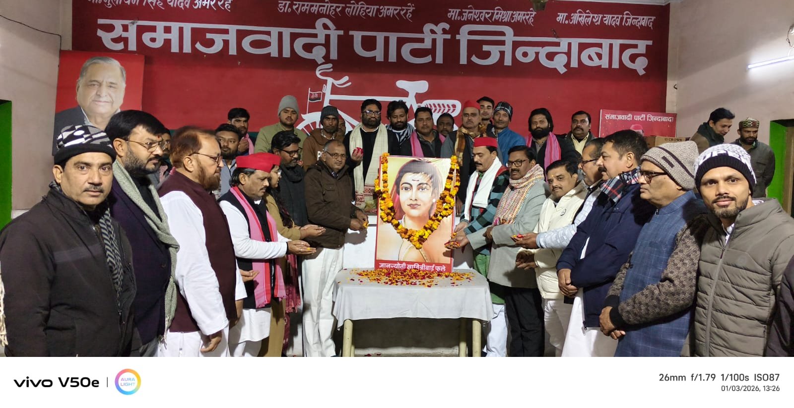 आज दिनांक 3 जनवरी 2026 को समाजवादी पार्टी के माननीय राष्ट्रीय अध्यक्ष एवं पूर्व मुख्यमंत्री श्री अखिलेश यादव जी के निर्देशानुसार क्रांतिकारी शिक्षाविद सावित्री बाई फुले जी की जयन्ती जनपद शाहजहांपुर बिजलीपुरा स्थित समाजवादी पार्टी के जिला कार्यालय पर मनाई गई….!इस मौके पर पार्टी के सभी नेताओं व पदाधिकारीयों एवं कार्यकर्ताओं ने उनके चित्र पर माल्या अर्पण कर पुष्प अर्पित किए और उनको याद किया…!इस मौके पर एक गोष्ठी का आयोजन सपा के जिला अध्यक्ष एवं पूर्व चेयरमैन श्री तनवीर खान की अध्यक्षता में किया गया और क्रांतिकारी शिक्षाविद सावित्री बाई फुले जी के योगदान पर चर्चा की गई….!इस मौके पर पूर्व विधायक राजेश यादव,पूर्व मंत्री अवधेश कुमार वर्मा, पूर्व विधायक रोशन लाल वर्मा,सपा प्रदेश सचिव रामसूरत यादव सपा प्रदेश सचिव विजय सिंह,सपा अल्पसंख्यक सभा के प्रदेश प्रमुख महासचिव सैयद रिजवान अहमद, पूर्व लोकसभा प्रत्याशी ज्योत्सना कश्यप,सपा नगर विधानसभा अध्यक्ष अतिउल्लाह सिद्दीकी, सपा महानगर अध्यक्ष चौधरी रामकुमार भोजवाल, सपा अनुसूचित जाति प्रकोष्ठ के प्रदेश सचिव विकास चंद्र एडवोकेट, सपा जिला उपाध्यक्ष अवधेश कुमार पाल सपा जिला उपाध्यक्ष संजीव कुमार वर्मा, सपा जिला उपाध्यक्ष ओंकार सिंह,सपा जिला उपाध्यक्ष अजफर अली खान, सपा जिला उपाध्यक्ष मिश्रीलाल पटेल,सपा नेता रामवीर सिंह सोमवंशी,सपा नेता जितेंद्र प्रसाद प्रधान, सपा नेता गोपाल अग्निहोत्री,सपा नेता लखन प्रताप सिंह, पूर्व सभासद दुर्गेश कुमार गुप्ता, सपा जिला उपाध्यक्ष सत्येंद्र यादव, सपा अल्पसंख्यक सभा के जिला अध्यक्ष हफीज अंसारी, सपा पिछड़ा वर्ग प्रकोष्ठ के प्रदेश सचिव मोनू कुरैशी, राजकुमार शर्मा नगर अध्यक्ष पुवायां,अनूप कुमार वर्मा,शहाब खान,अनवर सईद, अक्षय भोजवाल,धनपाल सिंह यादव, नेहाल खान,तय्यब खान, रामनिवास यादव, संतोष कुमार पाल, सुनील यादव विदेशी यादव,अरशद खान,इकबाल खान, तेजपाल यादव, शिवम राजपूत, अभिषेक गुप्ता,अवनीश यादव,अनिल दास,टिंकू सिंह, मोहम्मद शाहनवाज जिलानी,अजीम खान, शफी उर रहमान, सैयद शकील मियां,कौशल यादव, रुखसार अली, सौमित्र यादव, जितेंद्र कुमार, मोहम्मद रमीज, अरविंद सिंह यादव, सिद्दीक खान,खिज़र महबूब खान उर्फ चंदू, राकेश शुक्ला, पी. एल गौतम, सुनील सागर,जितेंद्र यादव, मोहम्मद रफी अंसारी, रमेश कश्यप,पवन वर्मा,रानू खान,आसिफ,मोहम्मद इकबाल मंसूरी, इमरान मंसूरी, असलम खान,गुलफाम,संजय कुमार पासवान, आसिफ कुरेशी,धर्मवीर पासवान,रोहित कुशवाहा, मोहित वर्मा, उमेश कश्यप, जोगिंदर सिंह यादव, अभिषेक दिनकर,मोहम्मद हसन, यश मौर्य श्लोक मौर्य,सपा जिला अध्यक्ष के प्रतिनिधि शाहनवाज आदि मौजूद रहे…..!