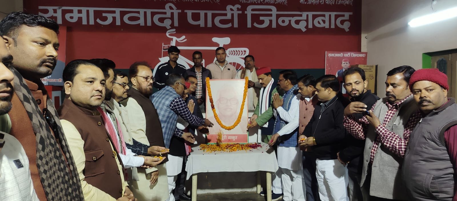 आज दिनांक 24 जनवरी 2026 को समाजवादी पार्टी के राष्ट्रीय अध्यक्ष मा.अखिलेश यादव जी के निर्देश पर महान समाजवादी नेता स्व.कर्पूरी ठाकुर जी की जयंती जनपद शाहजहांपुर बिजलीपुरा स्थित समाजवादी पार्टी के जिला कार्यालय पर मनाई गई…!इस मौके पर पार्टी के सभी नेताओं व पदाधिकारीयों एवं कार्यकर्ताओं ने उनके चित्र पर माल्यार्पण कर पुष्प अर्पित किए और उनको याद किया…!