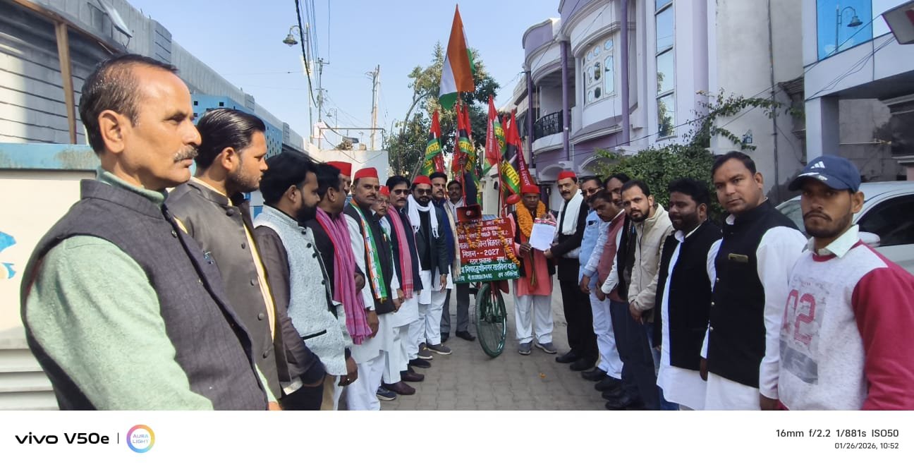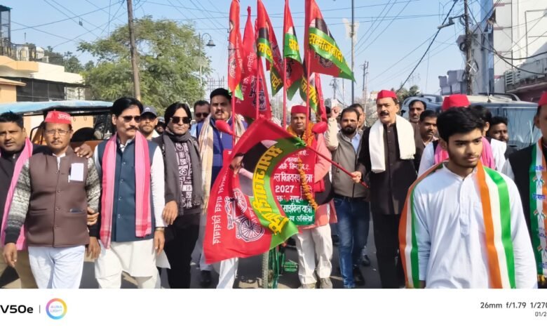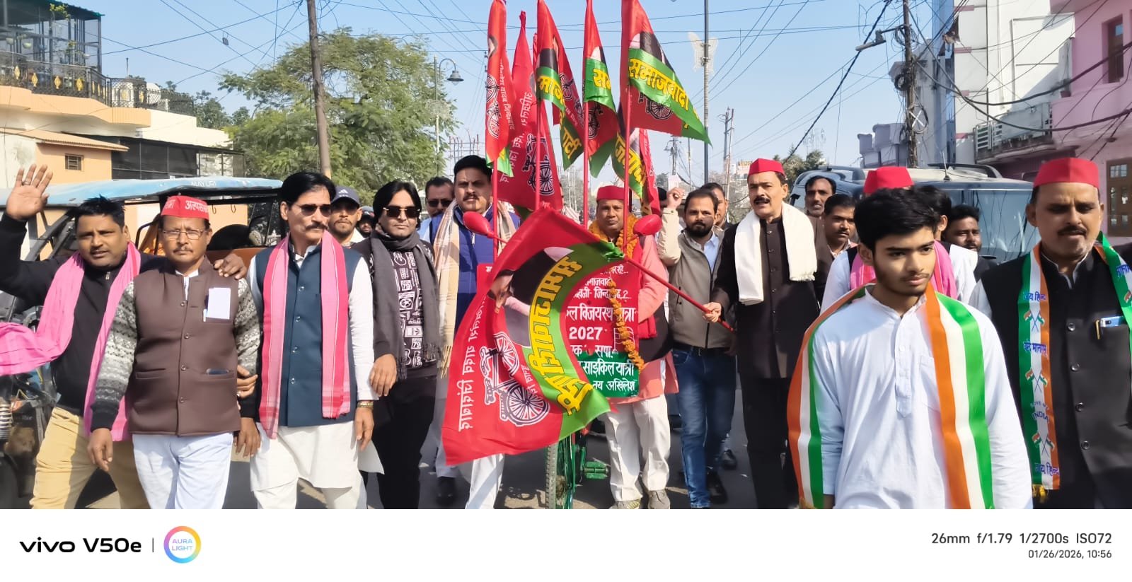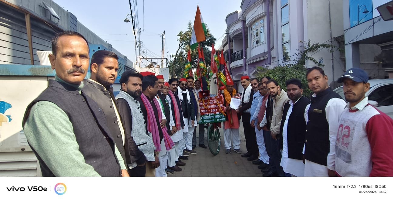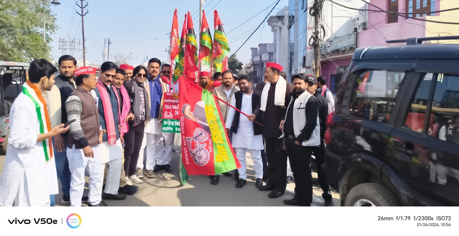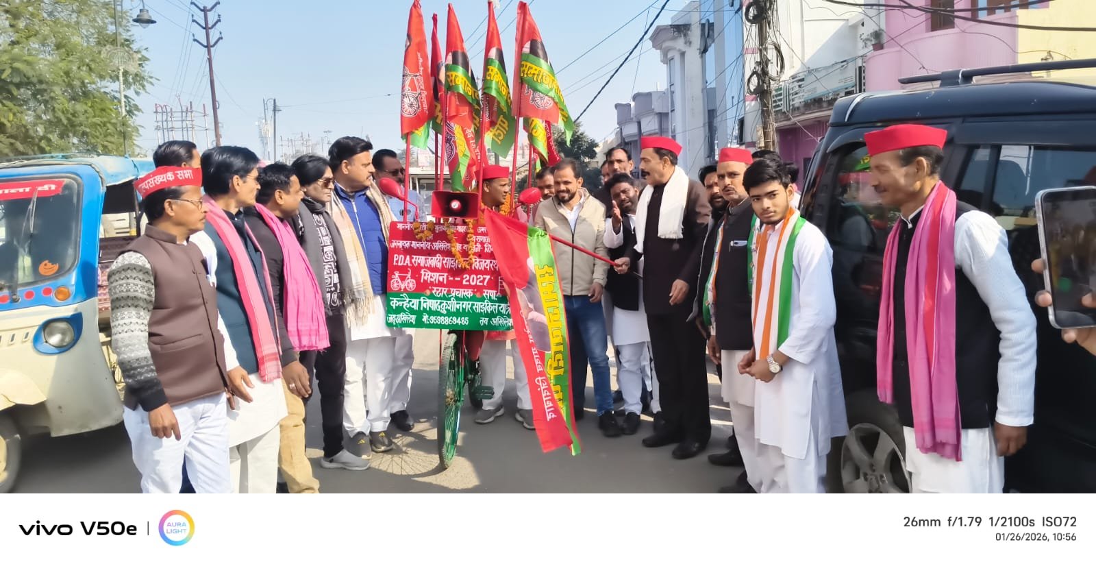 वर्ष 2027 में उत्तर प्रदेश में PDA व सपा सरकार बनाकर अखिलेश यादव जी को मुख्यमंत्री बनने के लिए जनपद कुशीनगर से 19 नवंबर 2025 को मिशन 2027 के तहत सपा नेता श्री कन्हैया निषाद ने PDA समाजवादी साइकिल विजय यात्रा की शुरुआत की….!जिसमें प्रदेश के सभी 18 मंडल व प्रदेश के 75 जिलों में समाजवादी पार्टी की नीतियों व PDA पर चर्चा और अखिलेश यादव जी के सिद्धांतों को जन-जन तक पहुंचाने का संकल्प लिया…!इसी के तहत दिनांक 26 जनवरी 2026 को जनपद हरदोई से PDA समाजवादी साइकिल विजय रथ यात्रा लेकर जनपद शाहजहांपुर पहुंचे..!जहां टाउन स्थित नगर निगम के पास सपा जिला अध्यक्ष तनवीर खान के नेतृत्व में सपा नेता कन्हैया निषाद का फूल माला पहनाकर जोरदार स्वागत कर रात्रि विश्राम महाकाली होटल में कराया…!और आज दिनांक 27 जनवरी 2026 को सपा जिला अध्यक्ष एवं पूर्व चेयरमैन श्री तनवीर खान ने जनपद बरेली के लिए फूल माला पहनकर समाजवादी पार्टी का झंडा दिखाकर PDA समाजवादी साइकिल विजय रथ यात्रा को रवाना किया…!इस मौके पर सपा अल्पसंख्यक सभा के राष्ट्रीय उपाध्यक्ष अनवर उल्ला खान, सपा नगर विधानसभा अध्यक्ष अतिउल्लाह सिद्दीकी, सपा जिला उपाध्यक्ष ओंकार सिंह यादव सपा जिला उपाध्यक्ष सत्येंद्र कुमार यादव, सपा अल्पसंख्यक सभा के प्रदेश सचिव परवेज अंसारी,सपा अल्पसंख्यक सभा के प्रदेश सचिव सरताज खान,सपा जिला सचिव संतोष कुमार पाल, सपा जिला सचिव सैयद शकील मियां,सपा जिला सचिव मोहम्मद फैसल,सपा जिला सचिव देवेंद्र कुमार मिश्रा एडवोकेट, सपा जिला सचिव इम्तियाज वली खान, अरशद खान, सिद्दीक खान,मुनीर, दिनेश कुमार,रवि प्रकाश पांडे, गुफरान खान,सलीम इदरीसी,फ़राज़ इदरीसी,आसिफ इदरीसी,आरिफ खान, रानू खान मोहम्मद ज़की, उवैस खान उर्फ़ मॉडल, सपा जिलाध्यक्ष के प्रतिनिधि शाहनवाज़ आदि मौजूद रहे…!