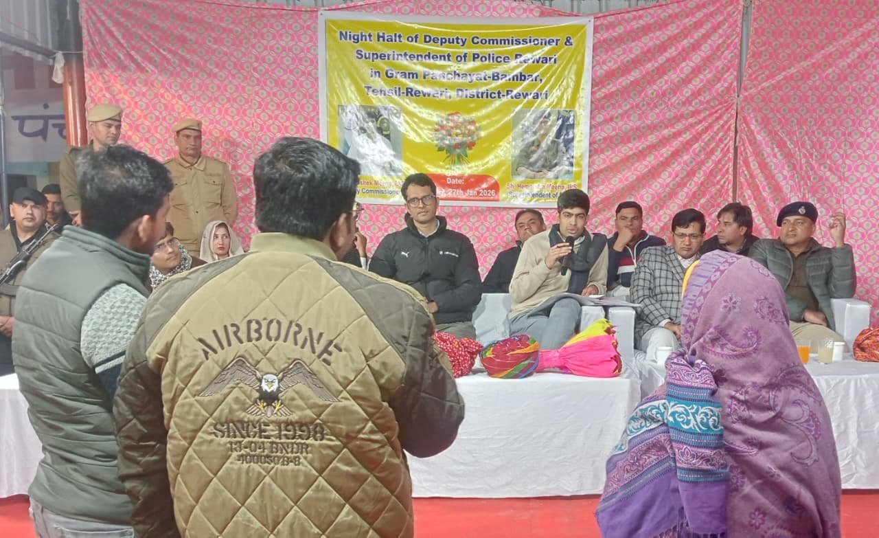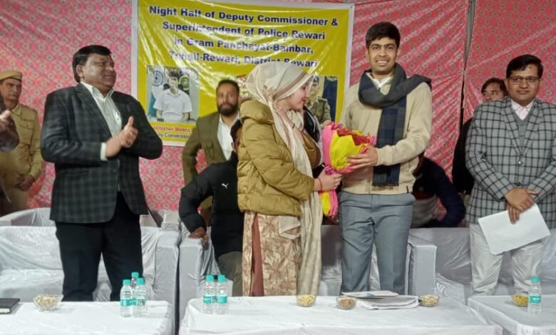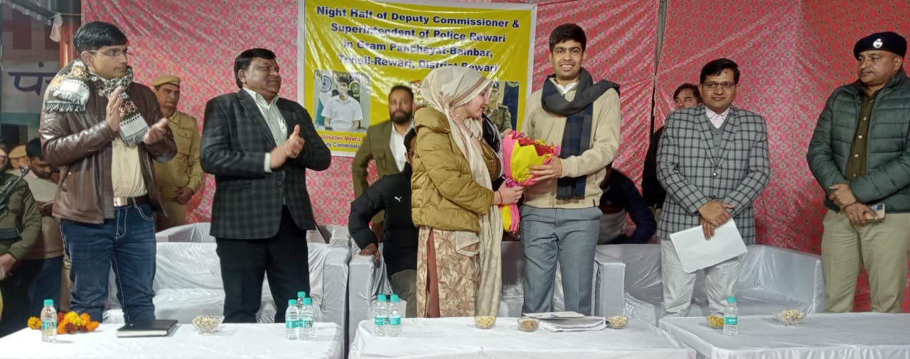 रेवाड़ी। हरियाणा के मुख्यमंत्री श्री नायब सिंह सैनी के निर्देशानुसार उपायुक्त अभिषेक मीणा की अध्यक्षता में जिला प्रशासन द्वारा रेवाड़ी जिले के गांव बाम्बड़ में मंगलवार को रात्रि ठहराव जन संवाद कार्यक्रम का आयोजन किया गया। कार्यक्रम में डीसी अभिषेक मीणा ने एसपी हेमेंद्र मीणा, एसडीएम सुरेश कुमार सहित विभिन्न विभागों के अधिकारियों के साथ ग्रामीणों से सीधा संवाद कर उनकी समस्याएं सुनीं और कई मामलों में मौके पर ही समाधान सुनिश्चित किया।गांव पहुंचने पर सरपंच सहित ग्रामीणों ने डीसी अभिषेक मीणा एवं एसपी हेमेंद्र मीणा का भव्य स्वागत व अभिनंदन किया। इस दौरान डीसी ने गांव के विकास से जुड़े सुझाव भी ग्रामीणों से प्राप्त किए।