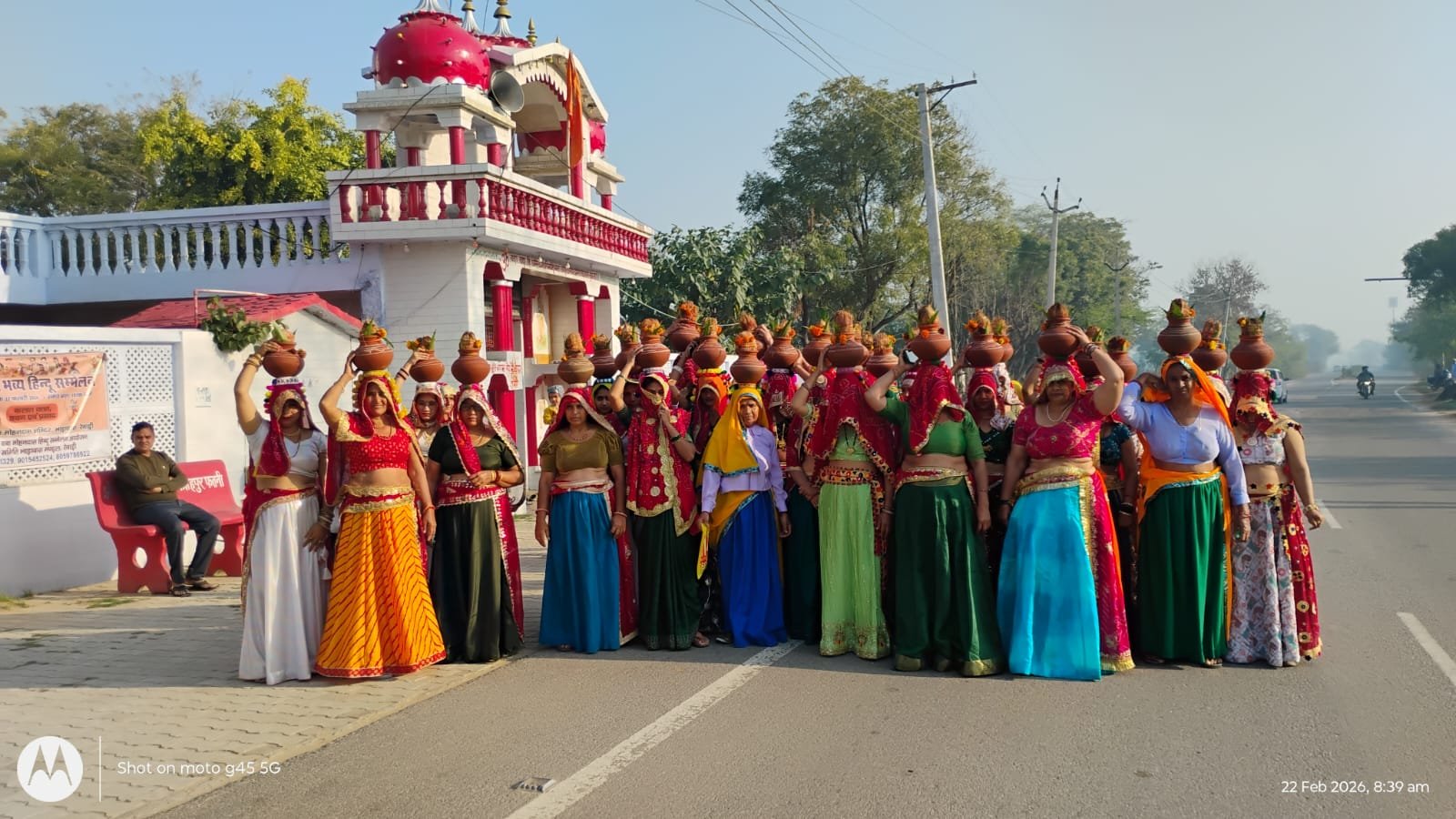 कार्यक्रम के तहत विभिन्न गांवों—खरसानकी, अकबरपुर, भाड़ावास, भीम खड़खड़ी, प्रहलादपुर सहित आसपास के क्षेत्रों से हजारों श्रद्धालु कलश यात्राओं के साथ मंदिर पहुंचे। महिलाएं डीजे की धुन पर नाचते-गाते कलश लेकर पहुंचीं, जिससे पूरा मंदिर प्रांगण भक्तिमय माहौल में डूब गया।
