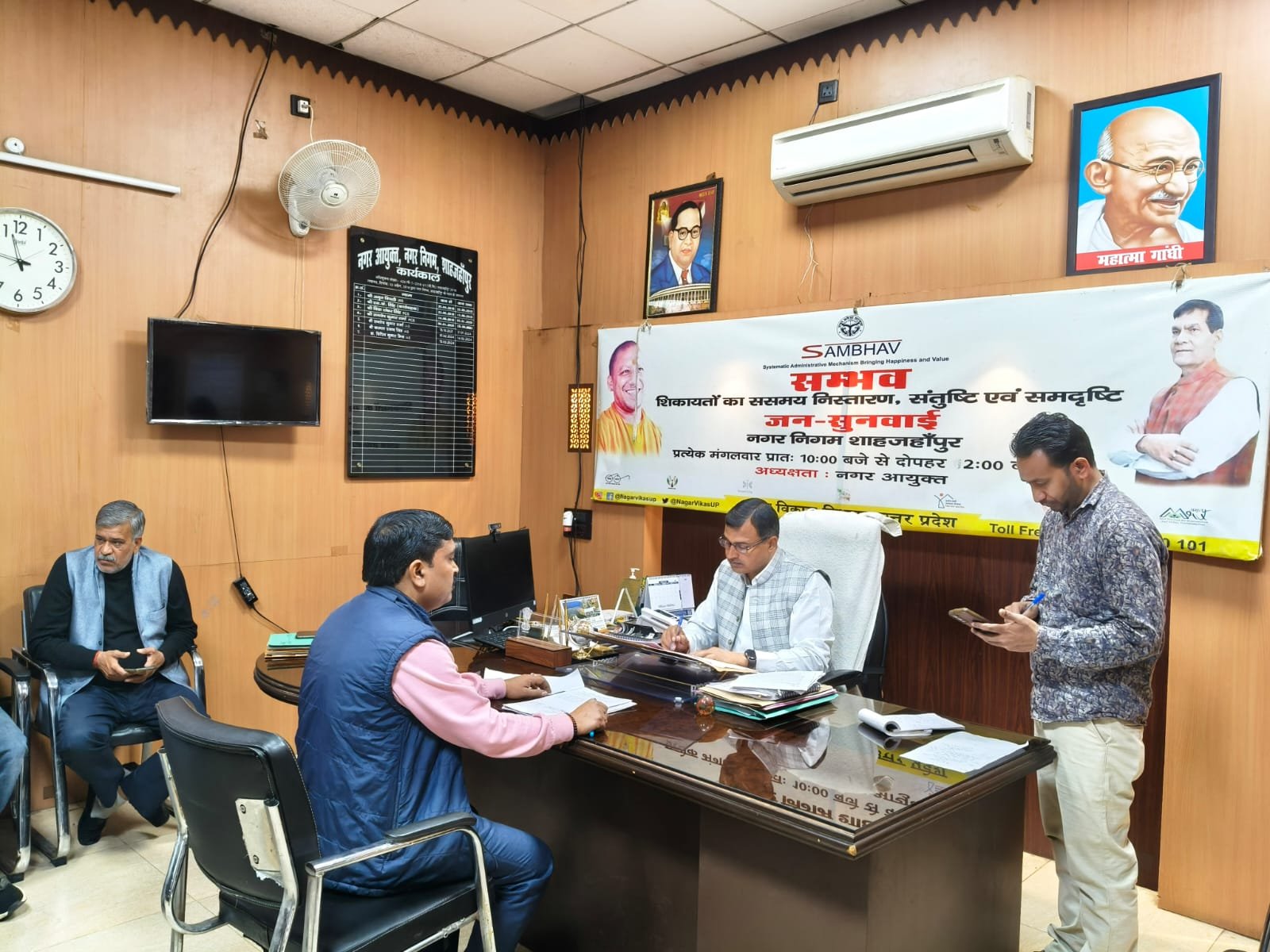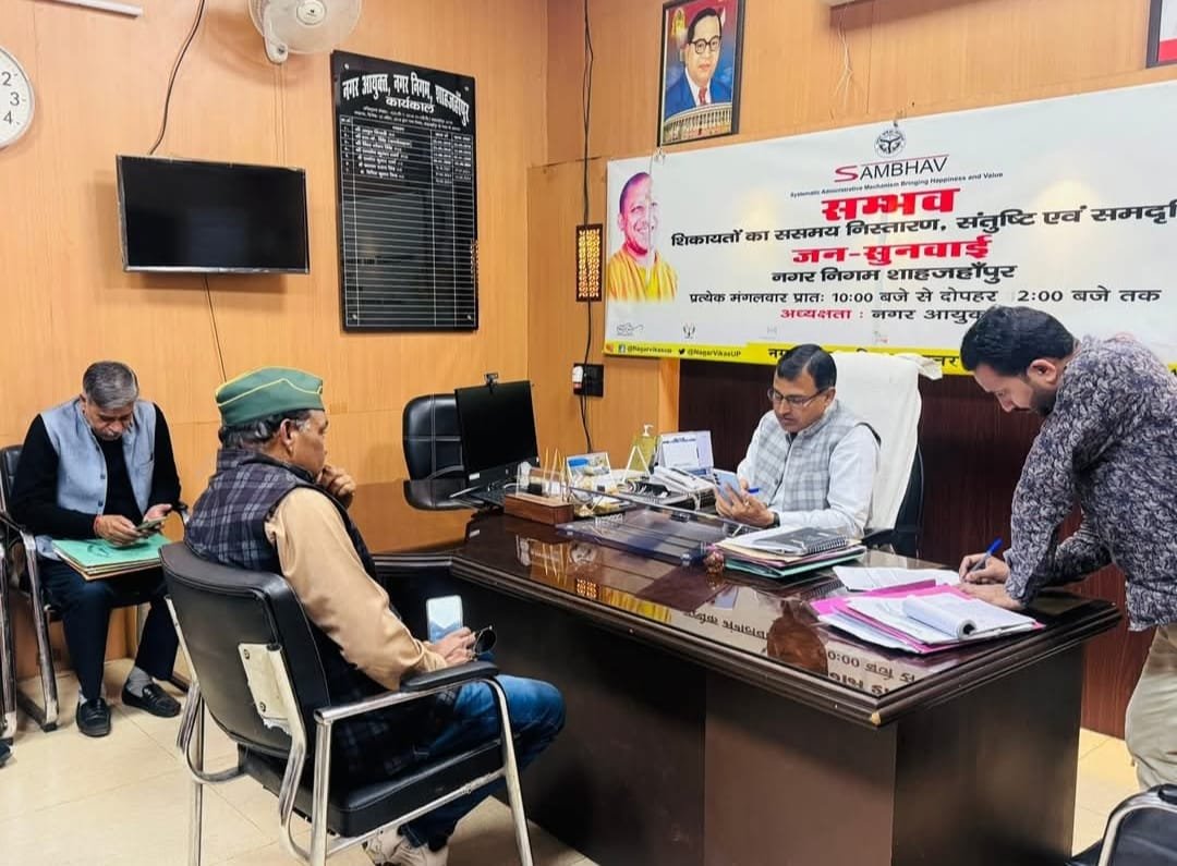 शाहजहांपुर। नगर आयुक्त डॉ0 बिपिन कुमार मिश्र की अध्यक्षता में मंगलवार को प्रातः 10 बजे से 02 बजे तक सिस्टेमैटिक एडमिनस्ट्रेटिव, मैकेनिज्म, ब्रिगिंग, हैपीनेन्स एण्ड वैल्यू (सम्भव) के अन्तर्गत नगर निगम कार्यालय में जन सुनवाई दिवस कार्यक्रम आयोजित किया गया। जिसमें नगर क्षेत्र के जन-सामान्य द्वारा जन-सुनवाई दिवस में सम्मलित होकर साफ-सफाई, शुद्ध पेयजल की आपूर्ति, प्रकाश बिन्दु, नाली निर्माण एवं कर विभाग से सम्बन्धित अपनी-अपनी समस्याओं एवं शिकायतों को रखा गया। जन सुनवाई दिवस में नगर क्षेत्र से प्राप्त जन समस्याओं-शिकायतों को गंभीरतापूर्वक सुना गया व जन-समस्याओं का गंभीरतापूर्वक संज्ञान लेते हुये संबन्धित विभागों के अधिकारियों/कर्मचारियों को निर्देशित किया गया कि प्राप्त शिकायतों को प्राथमिकता के आधार पर जन-सामान्य की संतुष्टि, समदृष्टि को ध्यान में रखते हुये ससमय निस्तारण कराया जायें। जन-सुनवाई दिवस में 07 समस्यायें / शिकायतें प्राप्त हुई, जिनके निस्तारण के लिए त्वरित कार्यवाही किये जाने हेतु सम्बंधित अधिकारियों को निर्देशित किया गया। जन सुनवाई दिवस में अपर नगर आयुक्त एस0के0 सिंह, सहायक नगर आयुक्त राजकुमार गुप्ता व अन्य अधिकारी कर्मचारीगण, जन-प्रतिनिधिगण तथा नगर के जन-सामान्य द्वारा सक्रिय प्रतिभाग किया गया।