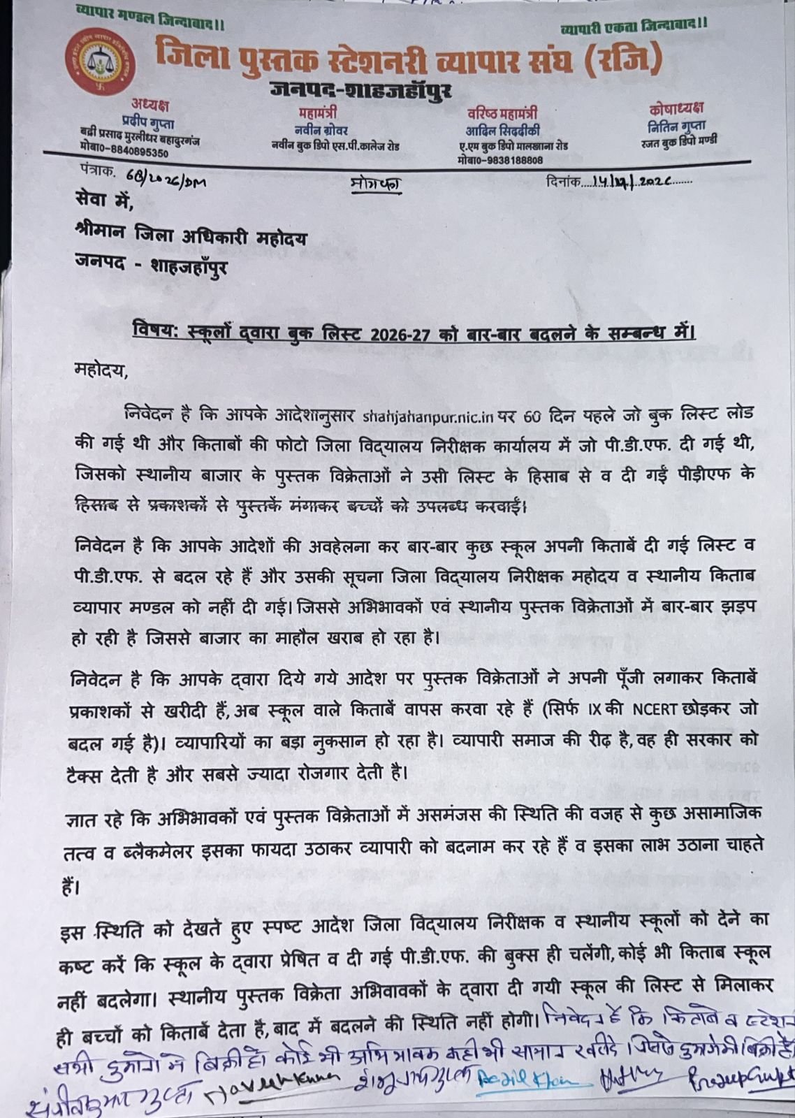 शाहजहांपुर। बुधवार को जिला पुस्तक स्टेशनरी व्यापार संघ (रजि.) के अध्यक्ष प्रदीप गुप्ता के नेतृत्व डीएम को एक मांगपत्र दिया गया। जिसमें अवगत कराया गया कि डीएम के आदेशानुसार shahjahanpur.nic.in पर 60 दिन पहले जो बुक लिस्ट लोड की गई थी और किताबों की फोटो जिला विद्यालय निरीक्षक कार्यालय में जो पी.डी.एफ. दी गई थी, जिसको स्थानीय बाजार के पुस्तक विक्रेताओं ने उसी लिस्ट के हिसाब से व दी गईं पीड़ीएफ के हिसाब से प्रकाशकों से पुस्तकें मंगाकर बच्चों को उपलब्ध करवाईं गई है। बताया कि जिला प्रशासन के आदेशों की अवहेलना कर बार-बार कुछ स्कूल अपनी किताबों की दी गई लिस्ट व पी.डी.एफ.बदल रहे हैं और उसकी सूचना जिला विद्यालय निरीक्षक व स्थानीय किताब व्यापार मण्डल को नहीं दी गई।