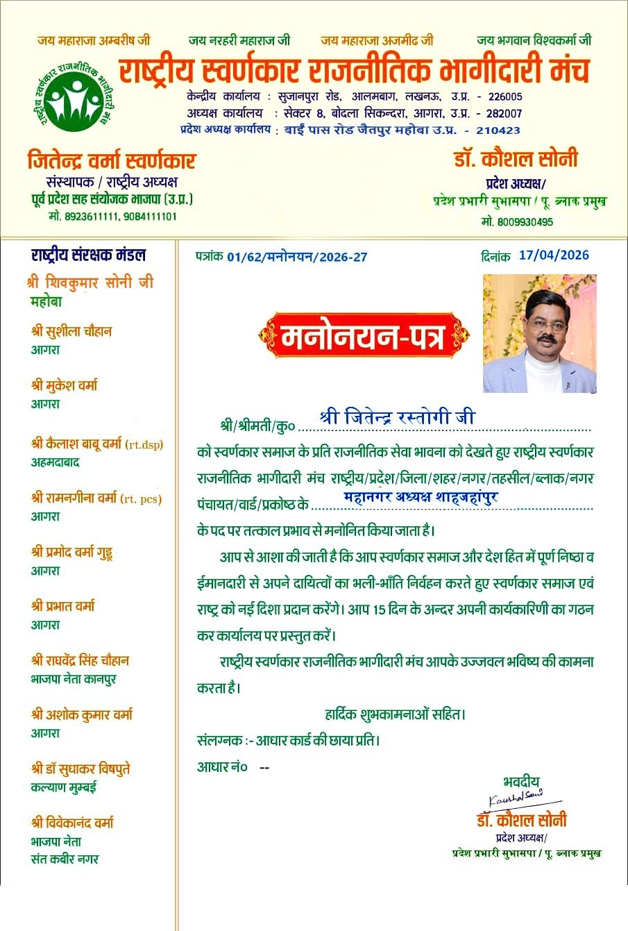 शाहजहांपुर। राष्ट्रीय स्वर्णकार राजनीतिक भागीदारी मंच के अंतर्गत स्वर्णकार समाज को सशक्त करने की दिशा में एक महत्वपूर्ण निर्णय लिया गया है।व्यापारी नेता एवं प्रदेश उपाध्यक्ष पंकज वर्मा सर्राफ की संस्तुति पर राष्ट्रीय अध्यक्ष जितेन्द्र वर्मा स्वर्णकार एवं प्रदेश अध्यक्ष कौशल सोनी ने शाहजहांपुर जनपद में दो प्रमुख पदाधिकारियों की नियुक्ति की घोषणा की है।