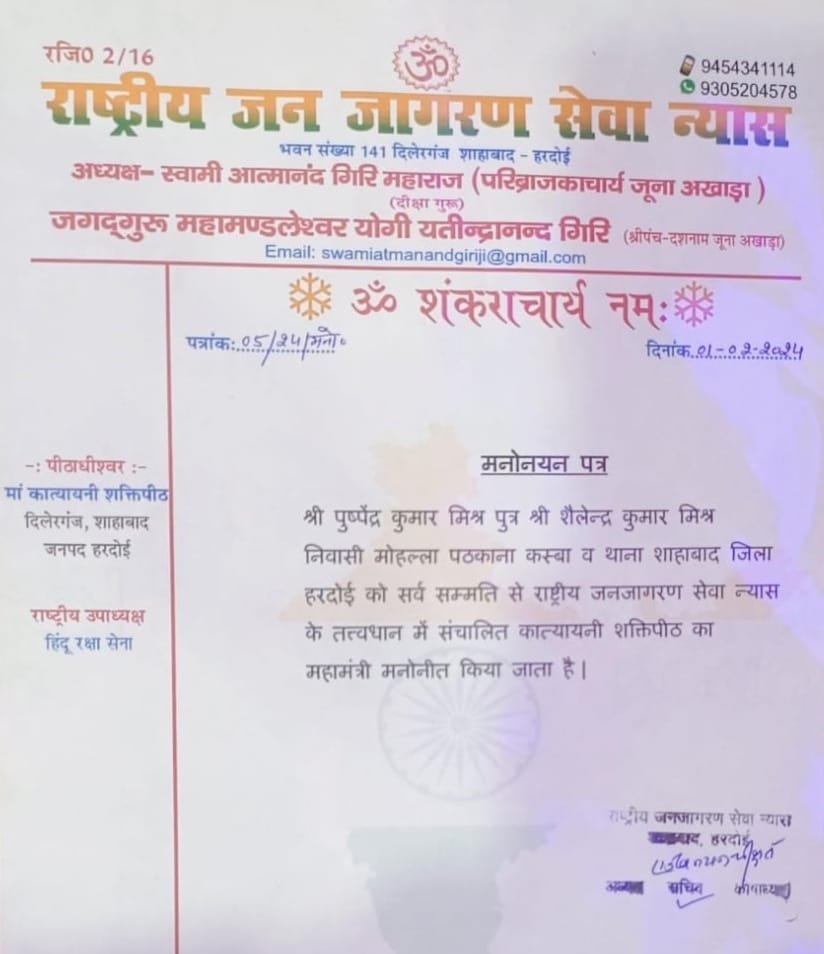 अध्यक्ष राष्ट्रीय जन जागरण सेवा न्यास एवं पीठाधीश्वर कात्यायनी शक्तिपीठ शाहाबाद के पावन सानिध्य में पुष्पेंद्र कुमार मिश्र पुत्र श्री शैलेन्द्र कुमार मिश्र निवासी मोहल्ला पठकाना कस्बा शाहाबाद जिला हरदोई को सर्व सम्मति से राष्ट्रीय जनजागरण सेवा न्यास के तत्त्वधान में संचालित कात्यायनी शक्तिपीठ का महामंत्री मनोनीत किया गया l
