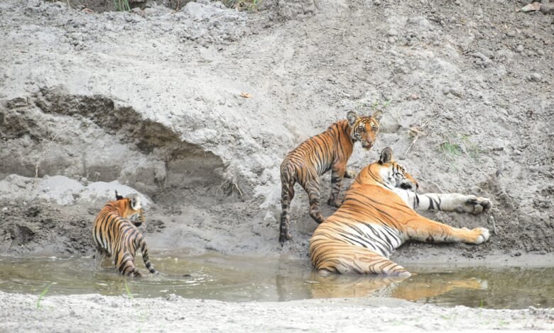 इस बढ़ते तापमान में जहां मनुष्य का जीना मुहाल है वही जंगल क़े जानवर भी इस भीषण गर्मी में व्याकुल दिखाई देते हैं. अगर बात करें दुधवा टाइगर रिजर्व के किशनपुर सेंचुरी की तो आज शाम किशनपुर टाइगर रिजर्व में बेलडंडा मादा अपने दो शावकों के साथ गर्मी से राहत पाती कुछ अलग अंदाज में ही दिखाई दी. पानी में मस्ती करने के बाद अपने बच्चों को दुलार करते भी दिखाई दी