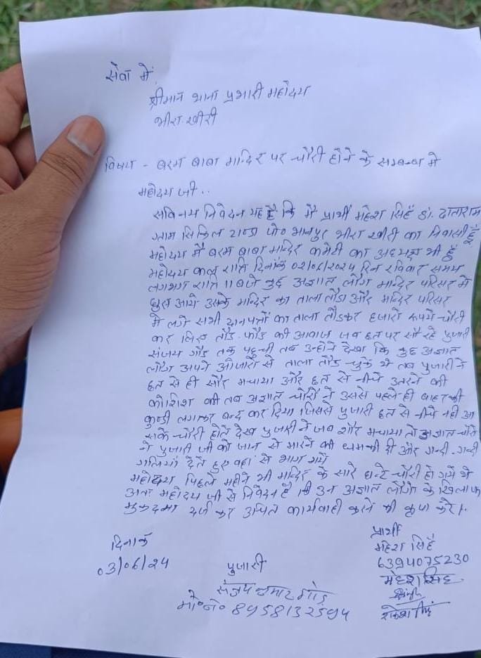 भीरा कोतवाली क्षेत्र से महज 5 किलोमीटर दूर लखीमपुर -भीरा हाइवे मार्ग पर स्थित बरमबाबा मंदिर से बीतीरात अज्ञात चोरों ने मंदिर के दानपत्रों के ताले तोड़ कर हजारो की नगदी उड़ा दी व पुजारी को शोर मचाने पर दी जान से मारने की धमकी ,मंदिर कमेटी अध्यक्ष ने भीरा पुलिस में अज्ञात चोरों के विरुद्ध तहरीर देकर कार्यवाही की मांग।
